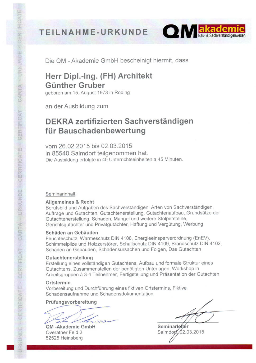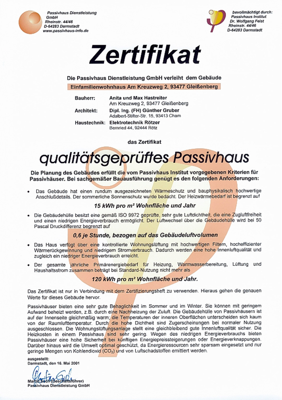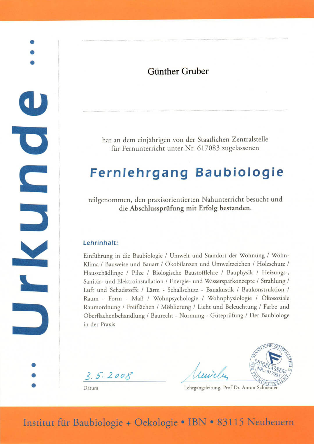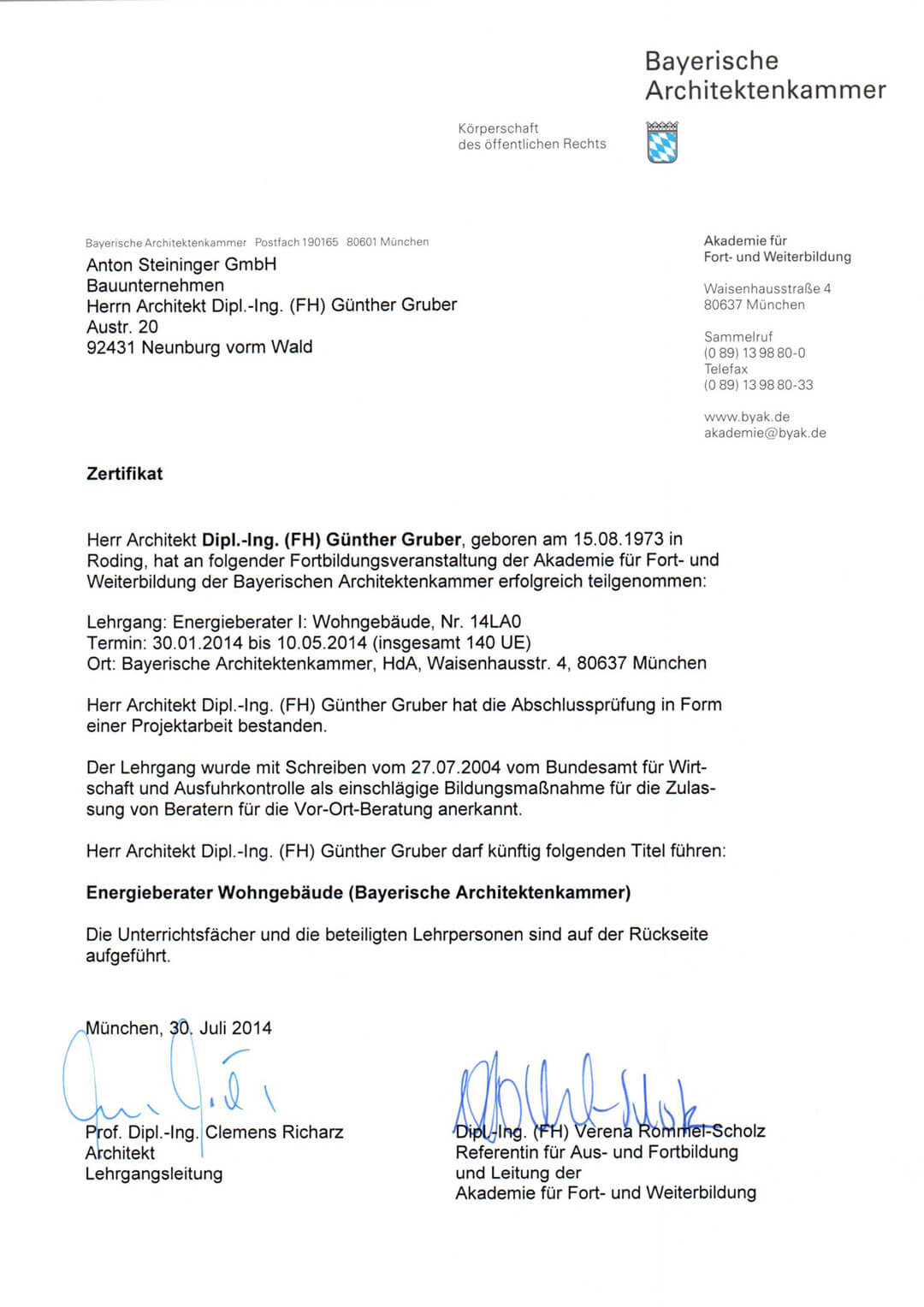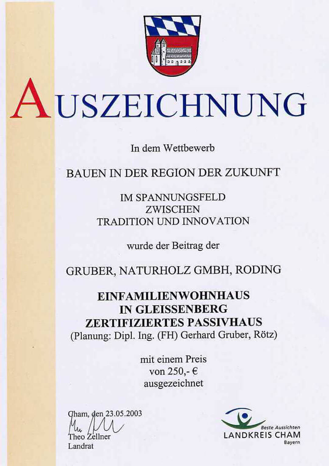 Als selbstständiger, geschäftsführender Gesellschafter der Firmen Gruber Naturholzhaus und Gruber Innenausbau GmbH bin ich unter Anderem mit dem bayerischen Integrationspreis, dem bayerischen Qualitätspreis und dem großen deutschen Fertighauspreis „Öko Cube“ ausgezeichnet worden.